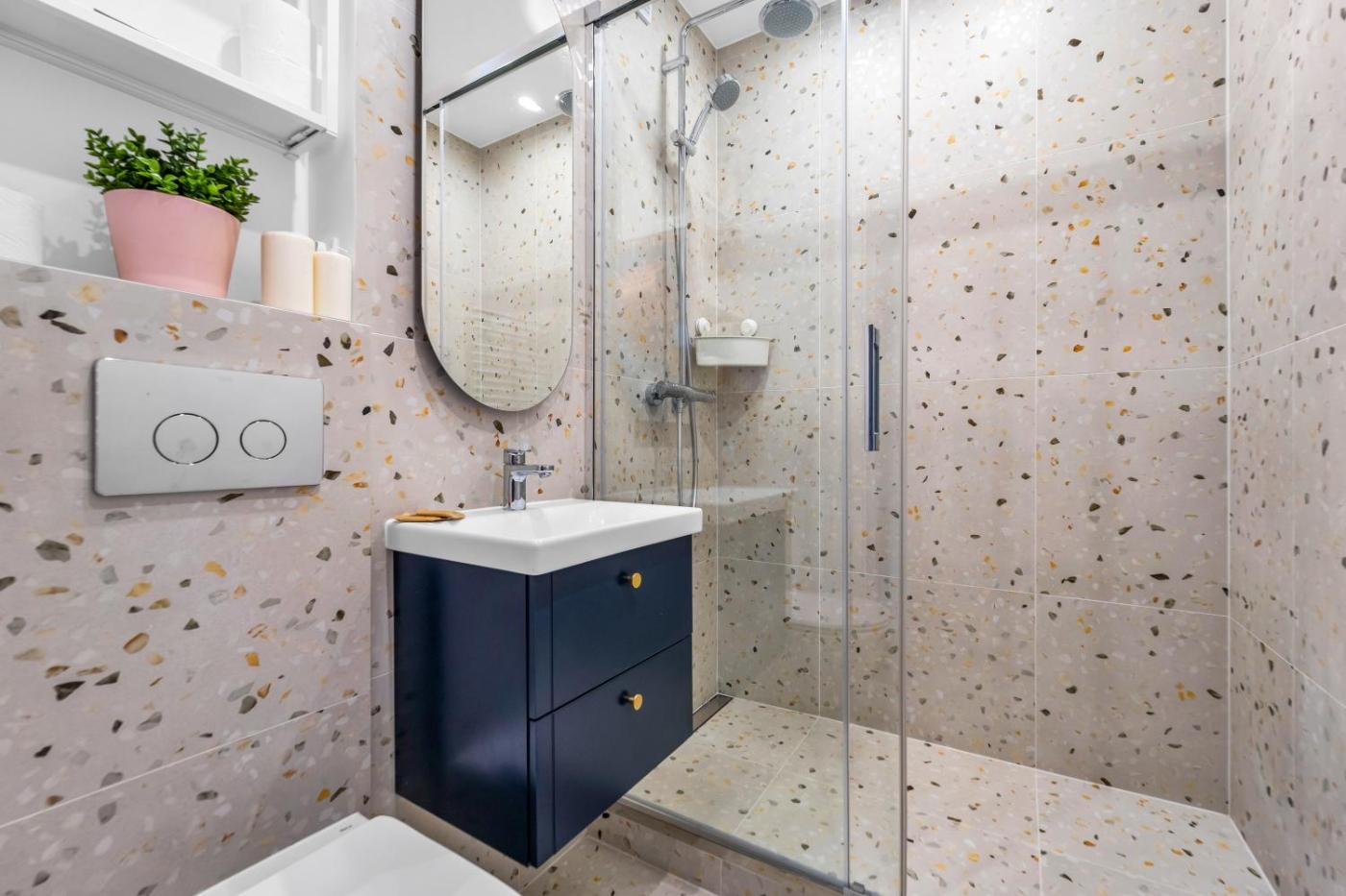 Apartament z 1 sypialnią. Featuring a private entrance, this apartment consists of a kitchenette, 1 bedroom and 1 bathroom with a shower and a hairdryer. Guests can make meals in the kitchenette that is equipped with a stovetop, a refrigerator, a dishwasher and kitchenware. This apartment features a washing machine, a dining area, flat-screen TV with streaming services, as well as chocolate for guests. The unit offers 1 bed. Apartament - 2 osobowy. Powierzchnia pokoju ok.: 26 mkw.